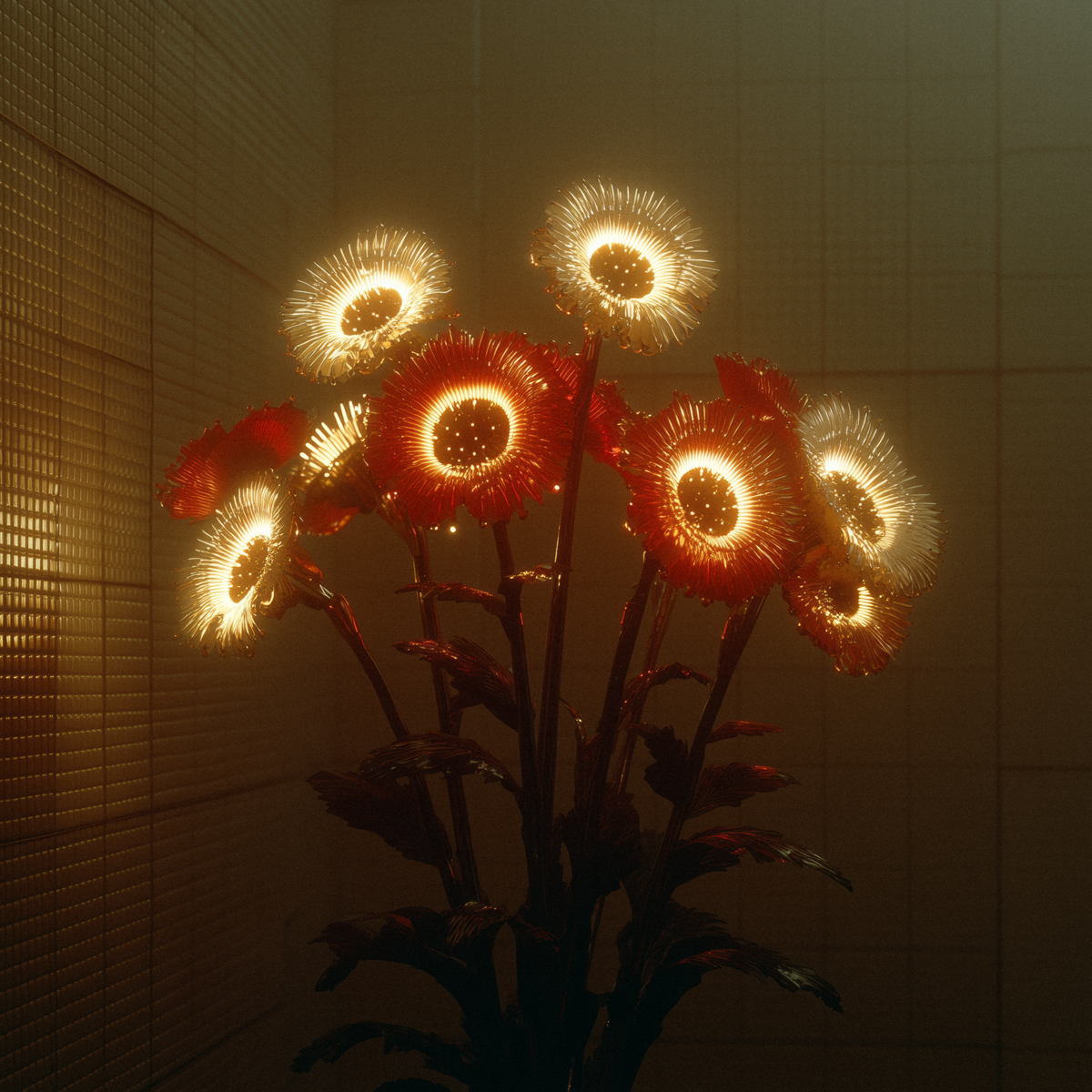 Created by Duncan Rawlinson using AI, this image depicts a cluster of brilliant, radiant flowers appearing to be cultivated in an off-world environment. The blooms, in deep reds and burnished golds, emit a warm glow that fills the clinical, tiled observation deck. The piece captures the quiet intensity of a biological discovery made during a long-range mission, blending organic mystery with the starkness of deep-space exploration.